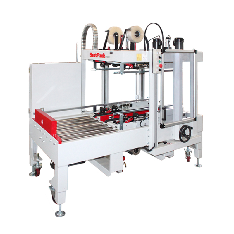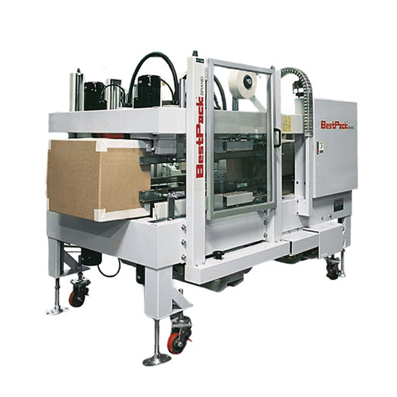 AT4E 為一四個外側角邊封箱機,促使封箱能達到密封度100%,可省去人工封紙箱四個角邊的高成本,本機型為手動調整的角邊封箱。
