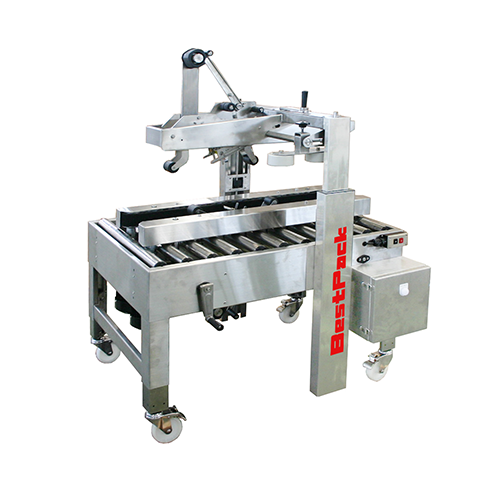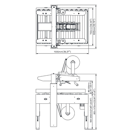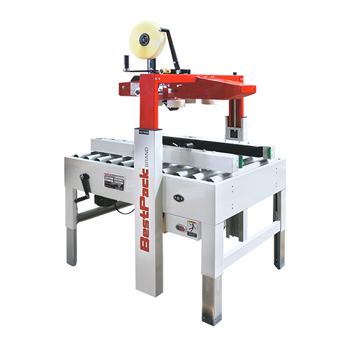 所有系統搭配我們的獨特抽取式”高速”貼帶器,附專利膠帶摺角長度調整板,和兩段式立柱,上機座可延伸加高,故封箱高度可以增加4″的高度。